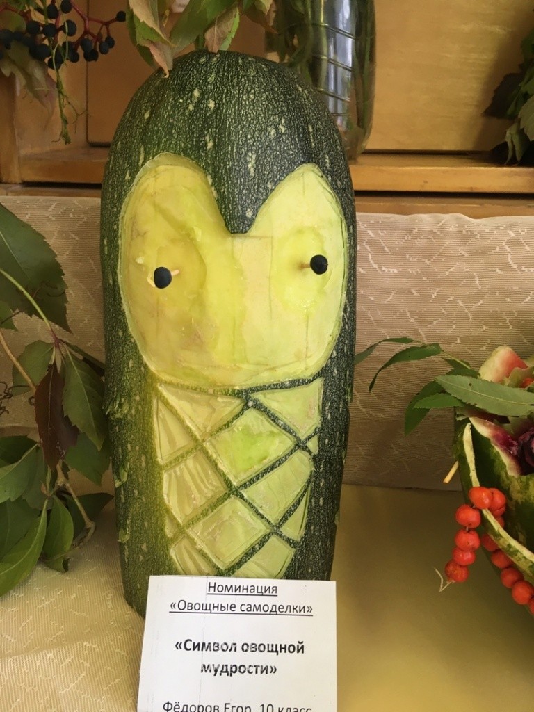 На выставке есть и прекраснейшие букеты в вазах из тыкв, которые несут нотки печали и грусти, ведь в них – краски и запах ушедшего лета, до которого ждать почти целый год. Есть здесь и причудливые овощи, похожие на чудищ с тремя головами, четырьмя руками или хвостами (это уж кто как видит). На выставке можно увидеть героев мультфильмов, сказочные героев, морских обитателей, вырезанных из кабачков и тыкв. И многое другое.