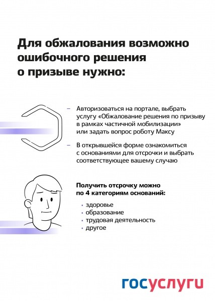 На сайте создан специальный раздел «Частичная мобилизация». Пользователю следует нажать на пункт «Обжаловать призыв по частичной мобилизации». Если у вас возникнут вопросы, то в этом вам поможет виртуальный ассистент Макс.