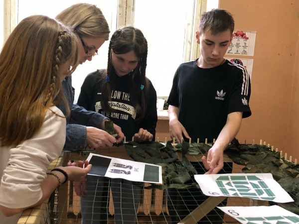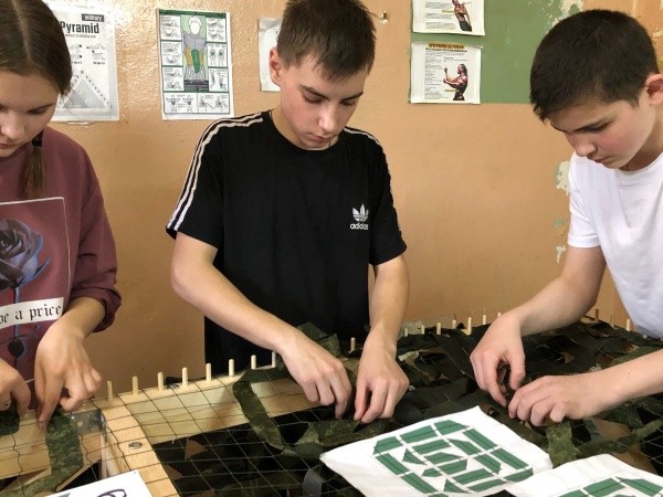 Девчонок и мальчишек из Звениговской санаторной школы-интерната научила плести маскировочные покрытия волонтёр Инна Калякина. Ребята присоединились к созданию сетей, потому что без элементов маскировки наши бойцы видны как на ладони.