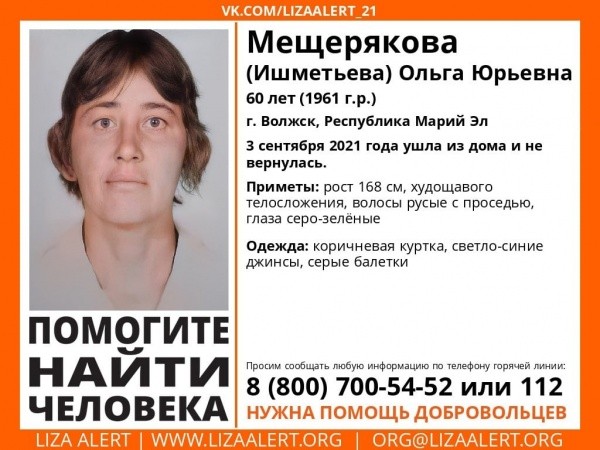 3 сентября ушла из дома в Волжске и не вернулась Мещерякова (Ишметьева) Ольга Юрьевна, 60 лет.