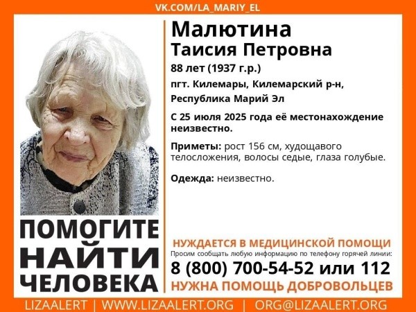 Поисковый отряд «ЛизаАлерт» Марий Эл просит помощи в поисках пропавшей 88-летней Таисии Петровны Малютиной.