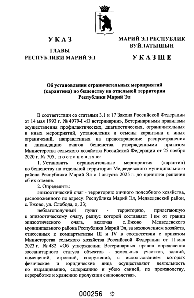 Карантин по бешенству объявили на территории села Ежово в Медведевском районе Марий Эл. Соответствующий указ подписал Глава республики Юрий Зайцев.