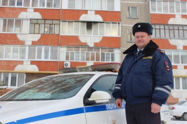 Горела квартира на третьем этаже. Страж порядка, не теряя времени, бросился на помощью Он забежал в подъезд и начал стучать в квартиру, из которой шел дым. Но хозяин квартиры не смог открыть дверь и тогда сотрудник ГИБДД попросил жильцов соседней квартиры впустить его на балкон.