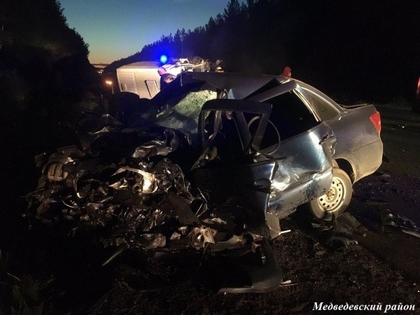 Первое ДТП зарегистрировано 22 июня около 00:20 на 81 километре автодороги «Вятка» Медведевского района. Предварительно установлено, что 58-летний водитель автобуса Citroen, не выбрав безопасную скорость, не справился с управлением и выехал на встречную полосу, где произошло столкновение с автомобилем "Лада Гранта". За рулем находился 27-летний мужчина. В результате до приезда скорой помощи скончались оба водителя и 22-летний пассажир "Лады".