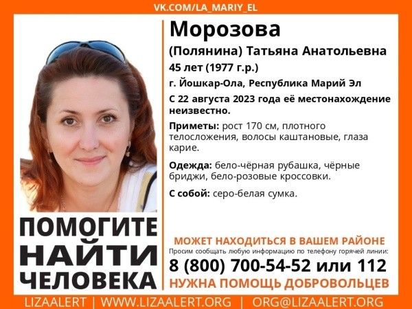 Поисковый отряд "ЛизаАлерт" разыскивает йошкаролинку по следующим приметам: рост 170 см, плотное телосложение, каштановые волосы, карие глаза. Одета в бело-черную рубашку, черные бриджи и бело-розовые кроссовки. С собой взяла серо-белую сумку.