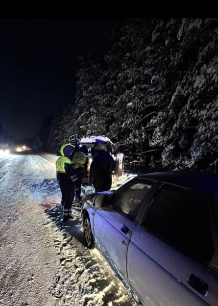 В салоне сломавшегося автомобиля находились водитель с супругой и малолетним ребенком. Сотрудники экипажа пересадили пассажиров к себе в салон, чтобы они согрелись.