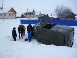 Фото с места ДТП, во время которого опрокинулся УАЗ и пострадали находившиеся внутри пассажиры, опубликовало ГУ МЧС России по Марий Эл.