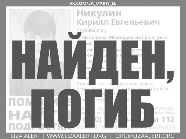 В поисково-спасательном отряде «Лиза Алерт» сообщили, что пропавший в Марий Эл 17-летний Кирилл Никулин найден погибшим.