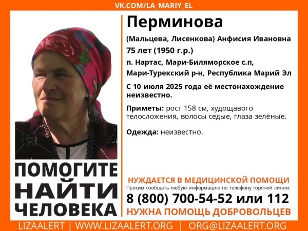 В последний раз 75-летнюю жительницу поселка Нартас Мари-Турекского района Марий Эл видели 10 июля. Приметы пропавшей: рост 158 см, худощавого телосложения, седые волосы и зеленые глаза.