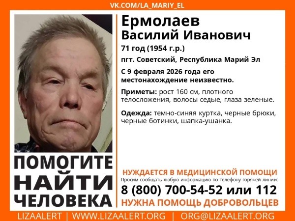 С 9 февраля в Марий Эл в поселке Советском ищут пропавшего 71-летнего Василия Ермолаева, нуждающегося в медицинской помощи.