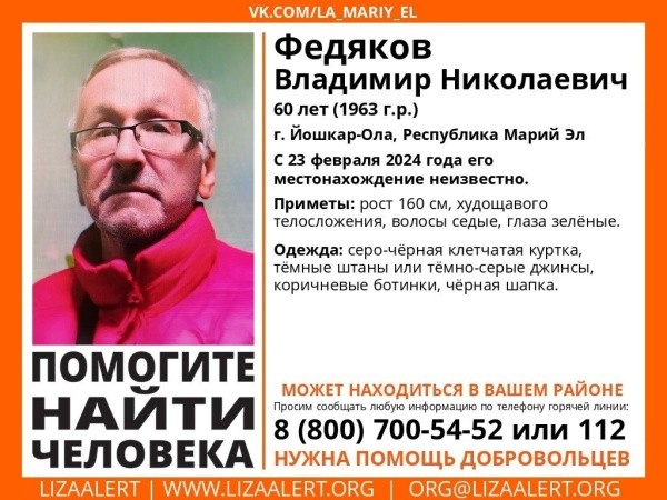 Местонахождение 60-летнего Владимира Николаевича Федякова неизвестно с 23 февраля.