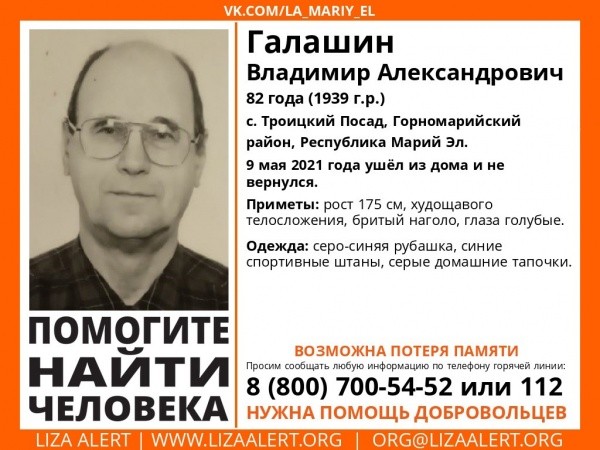 В Горномарийском районе пропал 82-летний Владимир Галашин. Он ушел 9 мая из дома в тапочках и не вернулся.