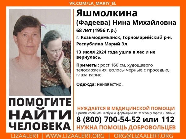 Поисковый отряд "ЛизаАлерт" разыскивает жительницу деревни Козьмодемьянска по следующим приметам: рост 160 см, худощавое телосложение, черные с проседью волосы, карие глаза. Во что одета женщина - неизвестно. Нуждается в медицинской помощи.