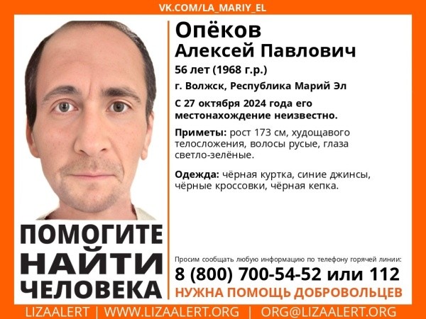 В Марий Эл о местонахождении жителя Волжска Опёкова Алексея Павловича ничего не известно с 27 октября.