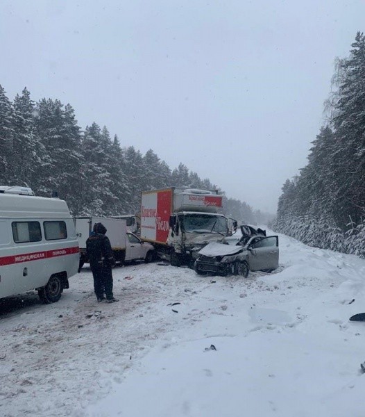 Первое ДТП произошло около 12:20 на 63 километре автодороги «Йошкар-Ола – Зеленодольск» (Казанский тракт) на территории Звениговского района. Предварительно установлено, что 40-летняя женщина-водитель автомобиля Kia в сложных дорожных и погодных условиях при выполнении обгона выехала на встречную полосу, но не смогла справится с управлением, и ее автомобиль занесло навстречу движущемуся грузовому автомобилю Hino. В результате произошло столкновение, от чего грузовик совершил наезд на автомобиль ВИС-234900. В ДТП погибли сама женщина-водитель Kia, ее 58-летний пассажир. Травмы получил 44-летний водитель Hino.