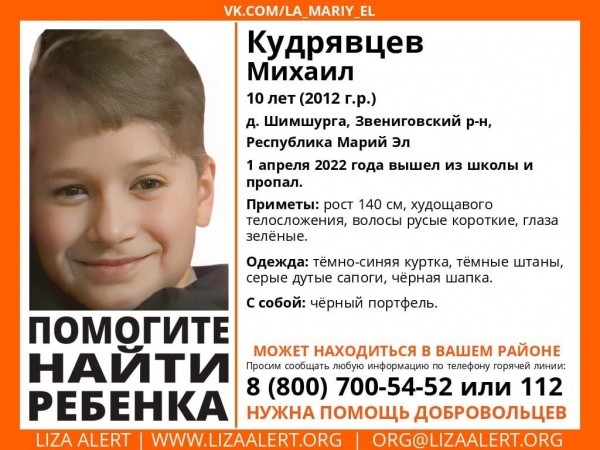 Напомним приметы Миши Кудрявцева: рост 140 сантиметров, худощавого телосложения, короткие русые волосы и зелёные глаза. В момент исчезновения на нём была тёмно-синяя куртка, тёмные штаны, серые дутые сапоги и чёрная шапка. Кроме того, при мальчике был чёрный портфель.