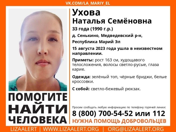 Всех, кому что-либо известно о местонахождении Натальи Уховой просят сообщить по телефону горячей линии поискового отряда "Лиза Алерт" Марий Эл 8 (800) 700 54 52 или 112.