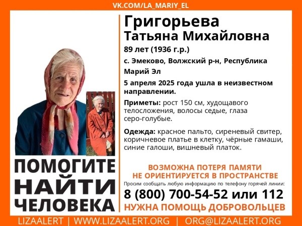 Волонтеры отряда «ЛизаАлерт» Республики Марий Эл просит помощи в поисках пропавшей.