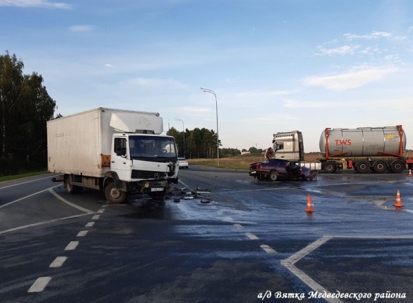 Вчера в Медведевском районе произошла серьезная авария. Около пяти часов вечера грузовик Mercedes врезался в легковушку.