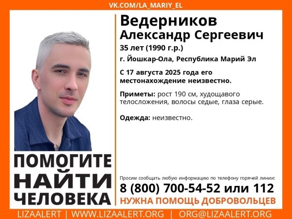 Местонахождение 35-летнего Александра Сергеевича Ведерникова из Йошкар-Олы неизвестно с 17 августа.