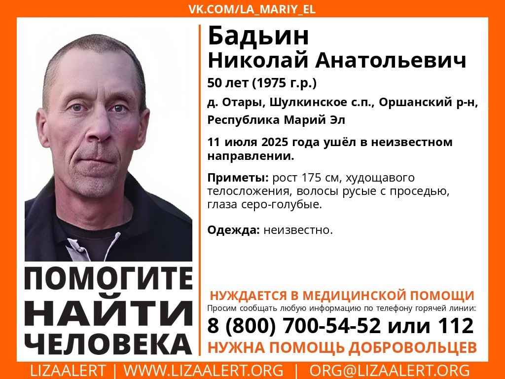 11 июля 50-летний житель деревни Отары Шулкинского сельского поселения Николай Бадьин ушел в неизвестном направлении. Приметы пропавшего: рост 175 см, худощавого телосложения, русые с проседью волосы, серо-голубые глаза. К сожалению, неизвестно, какая на нем была одежда.