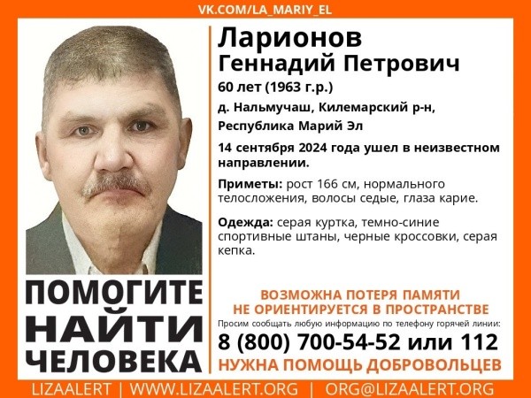 Поисковый отряд "ЛизаАлерт" разыскивает жителя деревни Нальмучаш Килемарского района по следующим приметам: рост 166 см, нормальное телосложение, седые волосы, карие глаза. Одет в серую куртку, темно-синие спортивные штаны, черные кроссовки и серую кепку.