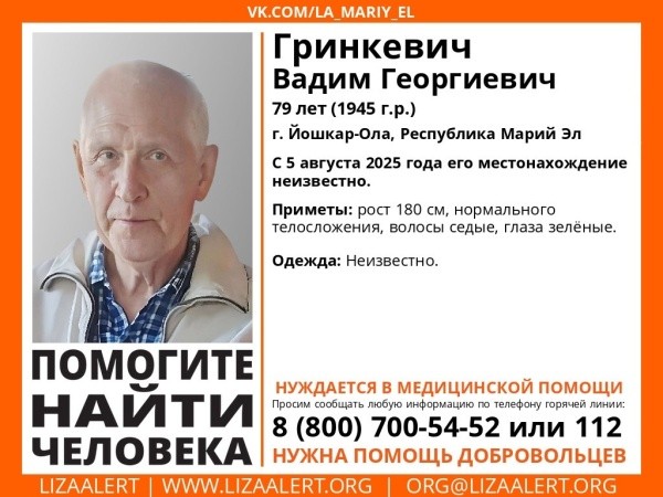 Пропал йошкаролинец Вадим Георгиевич Гринкевич. Его местонахождение неизвестно со вчерашнего дня. Основные приметы: рост 180 см, нормального телосложения, седые волосы, зеленые глаза.