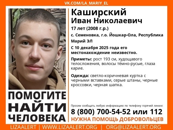 Приметами 17-летнего юноши из села Семеновка делится поисковый отряд «ЛизаАлерт» Республики Марий Эл: рост 193 сантиметра, худощавое телосложение, темно-русые волосы, карие глаза.