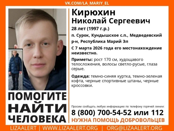 Местонахождение Николая Кирюхина 1997 года рождения неизвестно с 7 марта 2026 года.