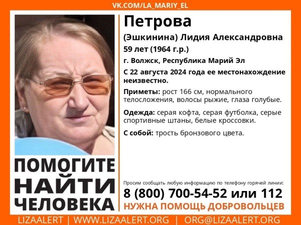 Поисковый отряд «ЛизаАлерт» Марий Эл просит жителей помочь в поисках 59-летней жительницы Волжска Петровой (Эшкининой) Лидии Александровны.