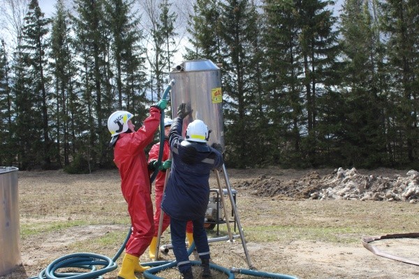 По замыслу учения, в попытке объехать внезапно возникшее дорожное препятствие водитель бензовоза потерял управление, опрокинулся на правый бок и съехал в кювет. В результате из-за образовавшейся в корпусе цистерны трещины произошел разлив нефтепродуктов.