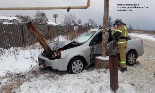 Метеоусловия все чаще приводят в ДТП в Марий Эл. Так, не справившийся с дорожными и погодными условиями, водитель иномарки врезался в газовую опору.