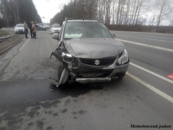 18 апреля около 9 часов утра на 98 километре автодороги «Вятка» 65-летний водитель за рулём Hyundai на нерегулируемом перекрёстке столкнулся с автомашиной Suzuki, ехавшей навстречу. По предварительным данным, водитель Hyundai при повороте налево не уступил дорогу Suzuki. В результате ДТП пострадала 62-летняя женщина-пассажир автомашины Hyundai, ей назначено лечение.
