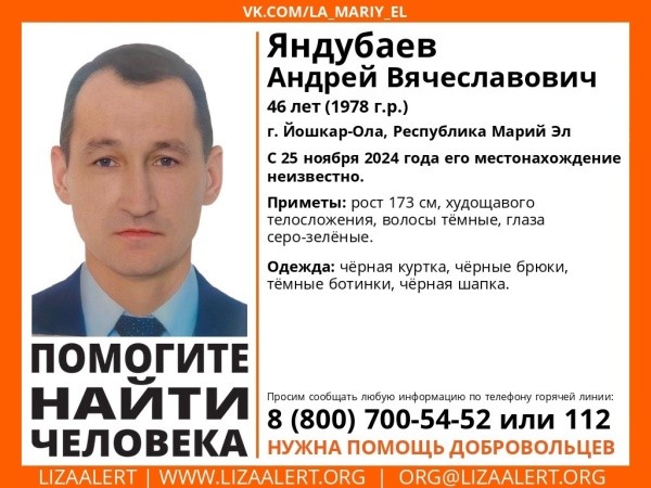Местонахождение 46-летнего Андрея Вячеславовича Яндубаева неизвестно с 25 ноября 2024 года.