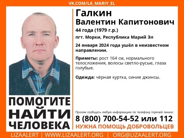 Поисковый отряд "ЛизаАлерт" разыскивает жителя поселка Морки по следующим приметам: рост 164 см, нормальное телосложение, светло-русые волосы, голубые глаза. Одет в черную куртку и синие джинсы.