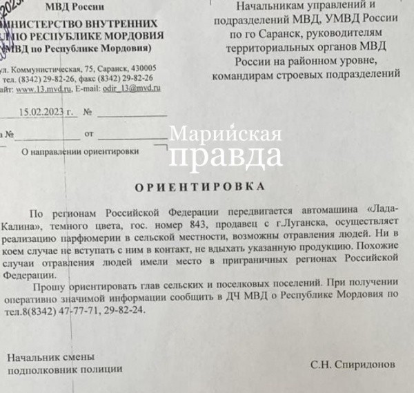 Информация о продаже духов, опасных для жизни, сейчас передается в Марий Эл и соседних регионах. Сообщения рассылаются на бланке МВД. В нем «правоохранители» предупреждают людей о том, что некий житель Луганска на темной «Ладе Калине» распространяет в сельской местности парфюмерию, которую ни в коем случае нельзя трогать и вдыхать. Это может быть опасно для жизни.