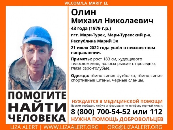Как сообщили в поисково-спасательном отряде "ЛизаАлерт Марий Эл", житель Мари-Турека ушел из дома в неизвестном направлении еще 21-го июля и с тех пор ничего о себе не сообщает. Приметы пропавшего: рост 183 см, худощавого телосложения, волосы рыжие с проседью, глаза серо-голубые. Мужчина был одет в темно-синюю футболку, темно-синие спортивные штаны, на ногах были черные сланцы.