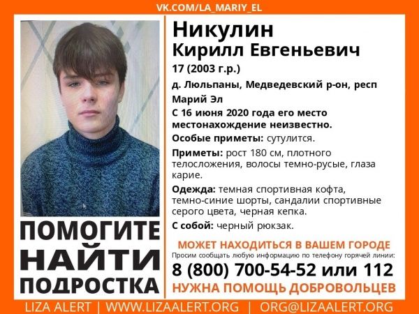 В Марий Эл ищут 17-летнего Кирилла Никулина, который пропал 16 июня в деревне Люльпаны Медведевского района Марий Эл. Об этом сообщили участники Добровольческого поисково-спасательного отряда «Лиза Алерт» - некоммерческое объединение, ставящее своей задачей поиск пропавших детей.