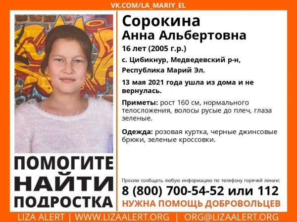 Пропавшую зовут Анна Альбертовна Сорокина. Ее приметы: рост 160 см, телосложение нормальное, волосы русые до плеч, глаза зеленые. Она одета в розовую куртку, черные джинсовые брюки и зеленые кроссовки. Всех, у кого есть какая-либо информация о подростке, просят сообщать по телефону горячей линии поискового отряда 8 (800) 700- 54-52 или по телефону 112.
