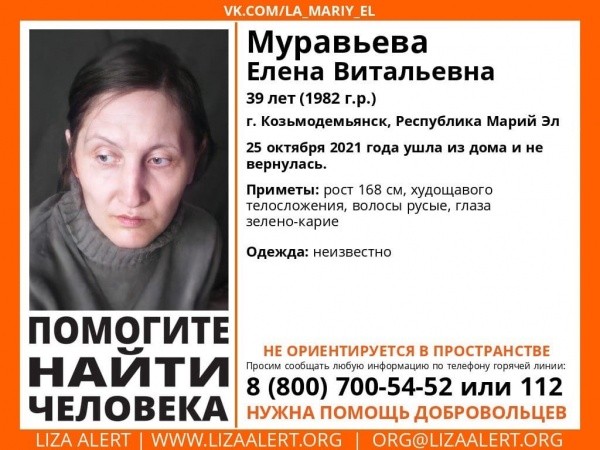 25 октября ушла из дома в Козьмодемьянске и до сих пор не вернулась 39-летняя Елена Муравьева. Приметы пропавшей: рост 168 сантиметров, худощавого телосложения, волосы русые, глаза зелено-карие.