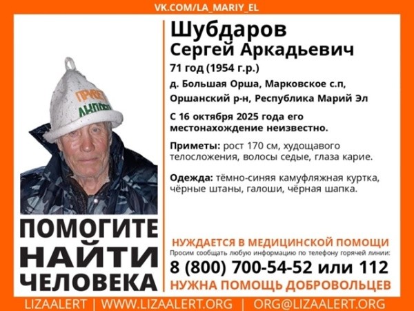 С 16 октября его местонахождение остаётся неизвестным. В день исчезновения он был одет в тёмно-синюю камуфляжную куртку, чёрные штаны, галоши и чёрную шапку. Сергею Аркадьевичу Шубдарову 71 год. Приметы: рост 170 см, худощавое телосложение, седые волосы и карие глаза.