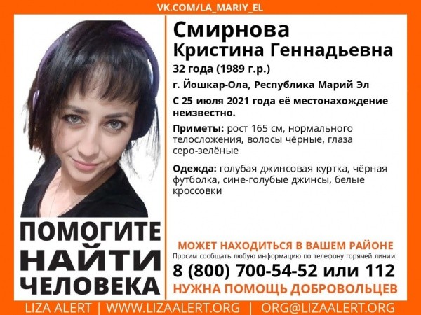 Жительница Йошкар-Олы Кристина Смирнова пропала 25 июля этого года, с этого времени информации о женщине нет. Об этом сообщает поисковый отряд «Лиза Алерт» Марий Эл.