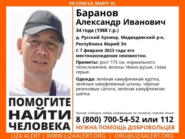 34-летний мужчина из деревни Русский Кукмор Медведевского района пропал 7 февраля. С тех пор его местонахождение неизвестно.