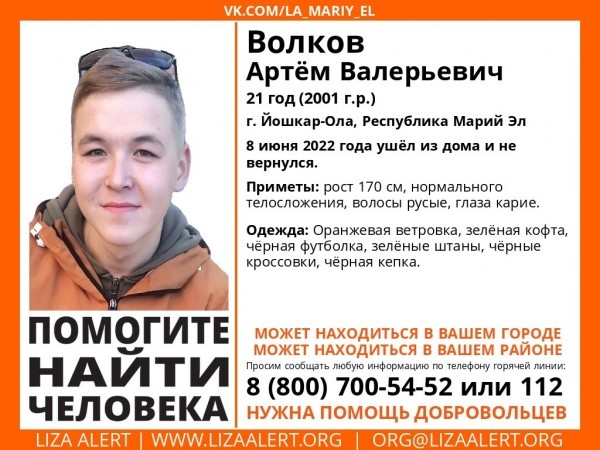 В Марий Эл разыскивают 21-летнего Артема Валерьевича Волкова. Йошкаролинец ушел из дома 8 июня и до сих пор не вернулся.