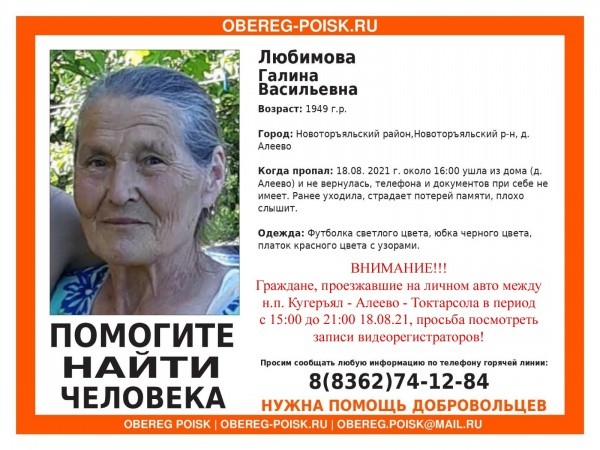 Галина Васильевна Любимова 1949 года рождения 18 августа вышла из своего дома в деревне Алеево. Она была одета в черную юбку и светлую футболку, на голове - красный платок с узорами. С собой пожилая женщина не взяла ни документов, ни денег. Пожилая женщина страдает потерей памяти и плохо слышит.