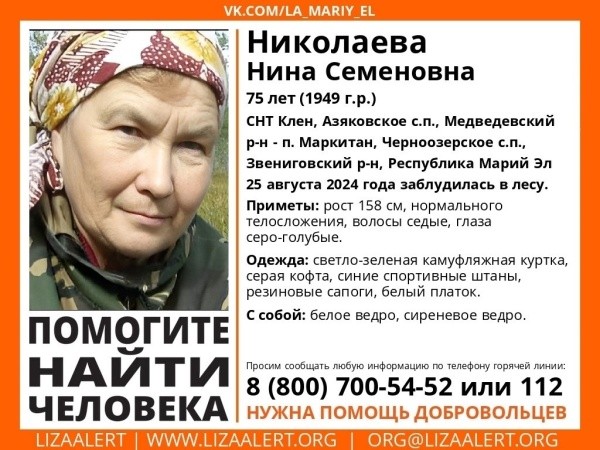 Поисковый отряд "ЛизаАлерт" разыскивает жительницу Медведевского и Звениговского районов по следующим приметам: рост 158 см, нормальное телосложение, седые волосы, серо-голубые глаза. Одета в светло-зеленую камуфляжную куртку, серую кофту, синие спортивные штаны, резиновые сапоги и белый платок. С собой взяла белое и сиреневое ведра.