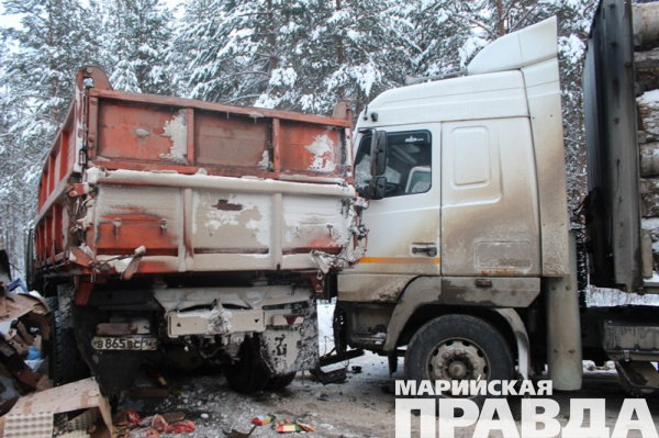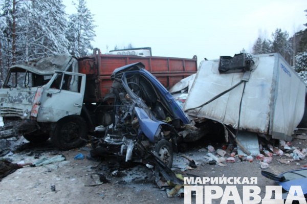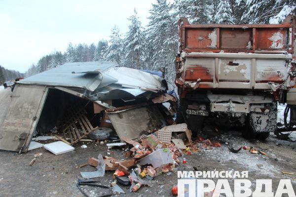 ДТП произошло сегодня на 49-м км автодороги Йошкар-Ола-Козьмодемьянск около 13.30, сообщает пресс-служба МВД по Марий Эл. Грузовая Газель и КамАЗ столкнулись лоб в лоб. От удара КамАЗ отбросило на стоящий на обочине лесовоз. В результате столкновения водители КамАЗа и Газели погибли на месте. Водитель лесовоза остался цел.