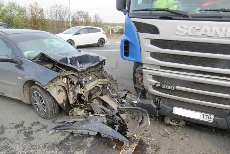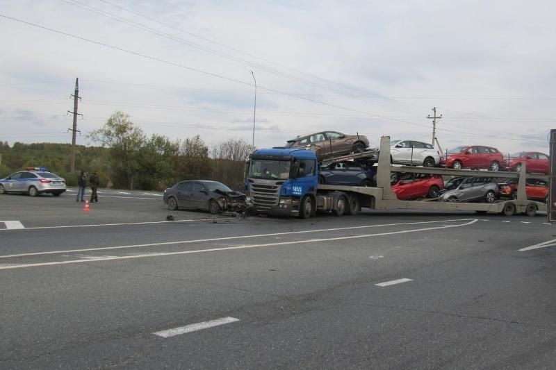 ДТП произошло днем 2 октября на 62-м километре Казанского тракта (а/д Йошкар-Ола–Зеленодольск). 59-летний мужчина за рулем грузовика Scania перевозил на полуприцепе около десятка новых автомобилей. По рабочей версии полиции, столкновение произошло из-за того, что, поворачивая налево, водитель не уступил дорогу иномарке Renault, которая двигалась ему навстречу.