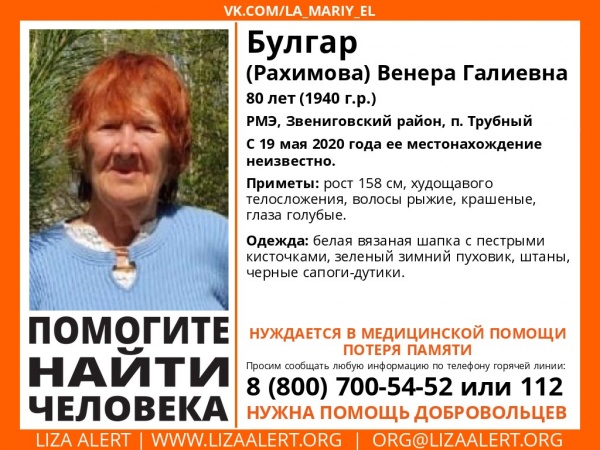 19 мая в посёлке Трубный Звениговского района Марий Эл пропала бабушка с потерей памяти. Последний раз её видели на мосту через реку Илеть близ ПГТ Красногорский — это было 19 мая в 14:30. Дальнейшее её местонахождение неизвестно. Об этом сообщает паблик Вконтакте «Поисковый отряд Лиза Алерт Марий Эл».