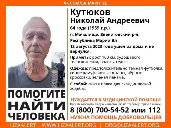 Поисковый отряд «ЛизаАлерт» разыскивает жителя Звениговского района из поселка Мочалище. Основные приметы: рост 160 см, худощавое телосложение, седые волосы. Предположительно одет в темную футболку, синие камуфляжные штаны, черные кроссовки и зеленую панаму. С собой взял синюю палку для скандинавской ходьбы.
